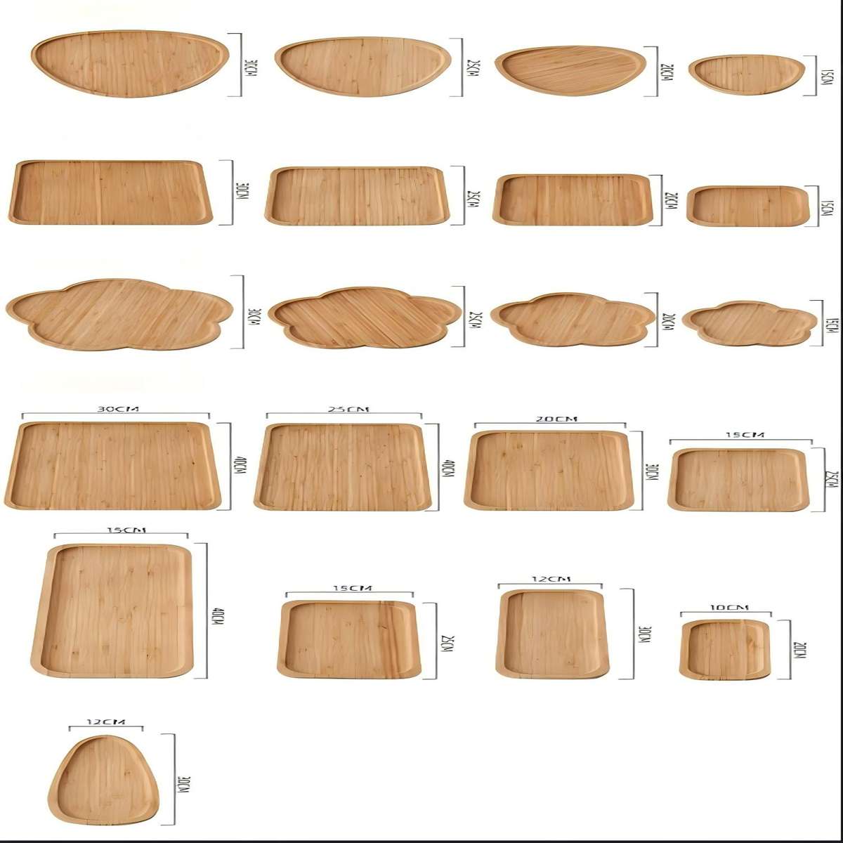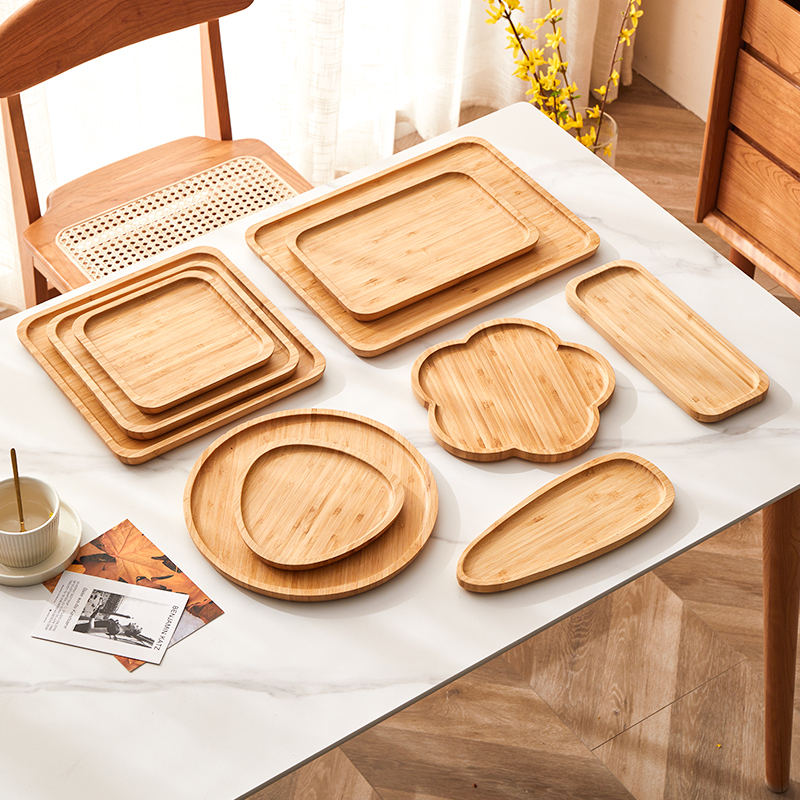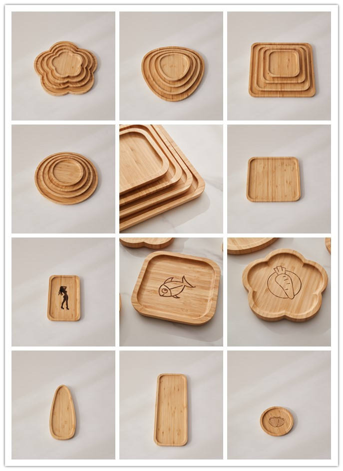 Kitchen and tabletop items (cutting boards, trays, utensils, organisers, coasters), bathroom and storage pieces (caddies, soap dishes, toothbrush holders, boxes), desktop and gift items (pen holders, phone stands, clocks, frames), and simple small furniture/organisers (shelves, racks, risers) made from solid wood, bamboo and engineered bamboo/wood panels. Options include mixed-material designs combining bamboo/wood with glass, metal or plastics.