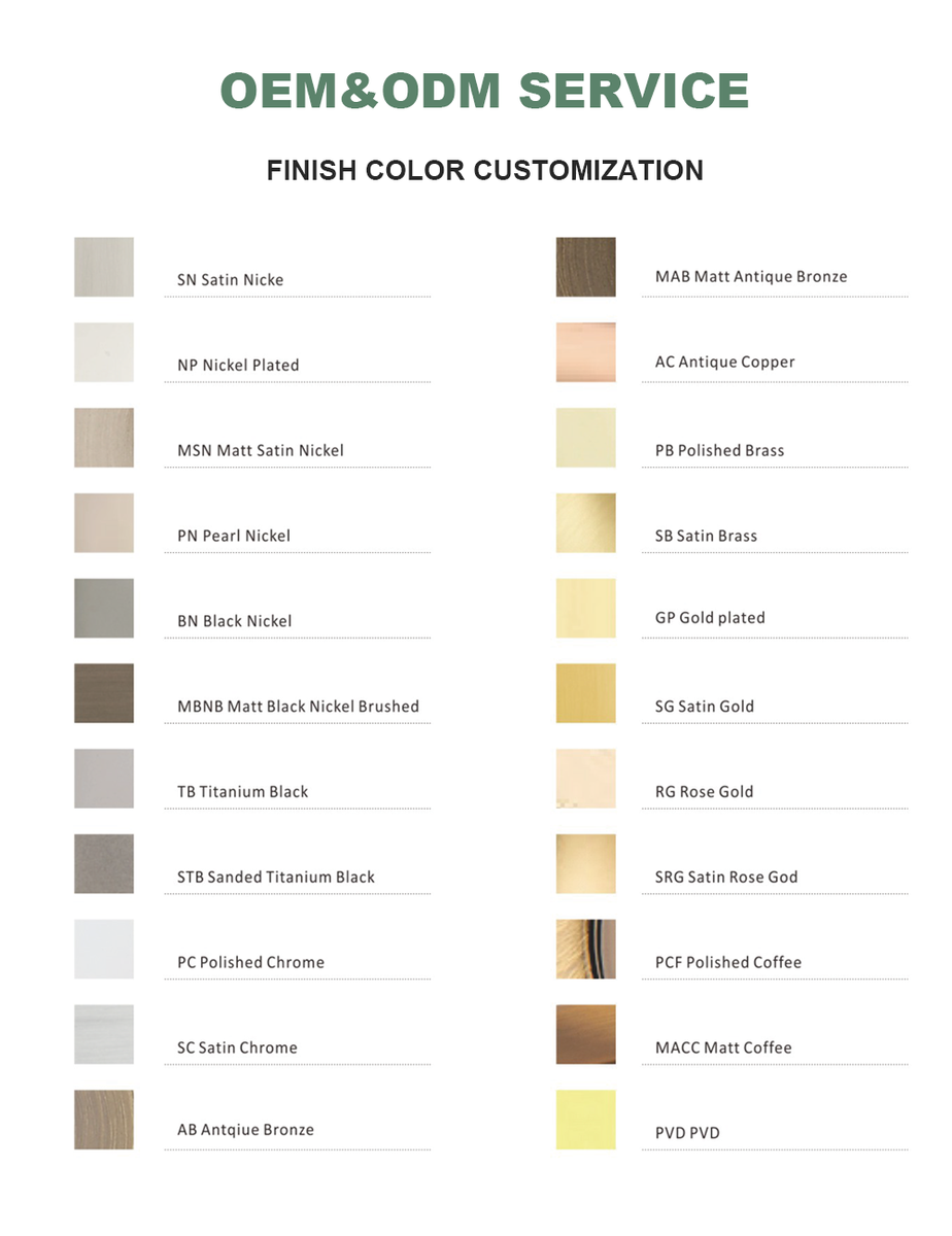 B. Optional: matte black, brushed nickel, gunmetal, antique bronze, PVD finishes (range-dependent)