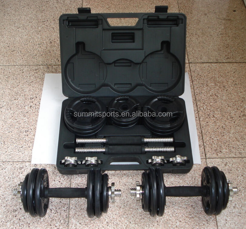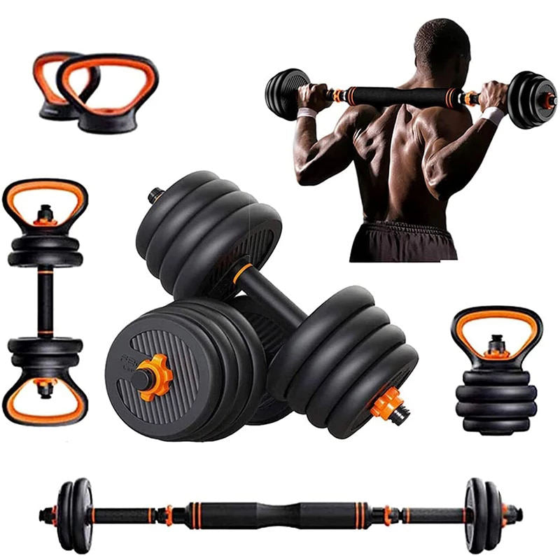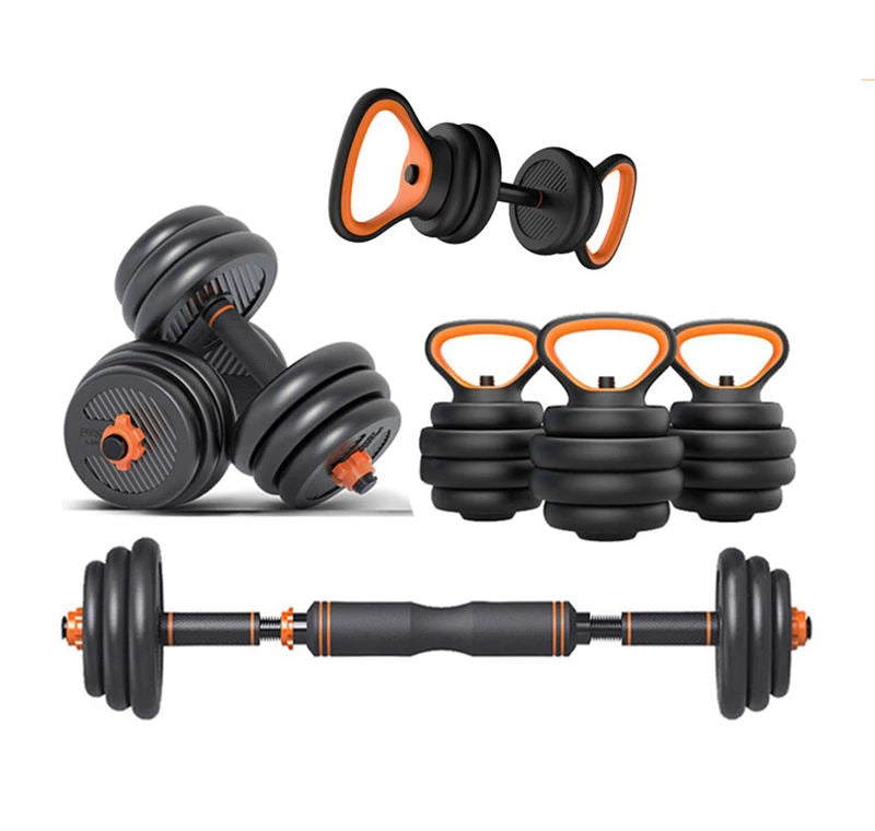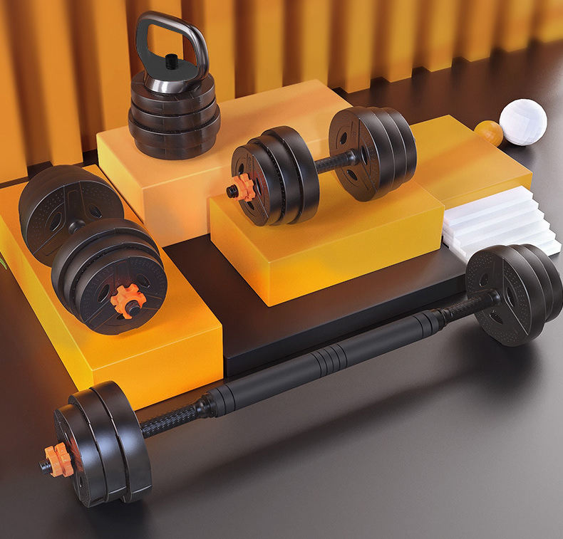 Fixed and adjustable dumbbells (cast iron, vinyl, neoprene, rubber and urethane), kettlebells, weight plates, barbells and bars, plus gym accessories such as resistance bands, yoga mats, foam rollers, skipping ropes, ab wheels, push-up bars and simple storage racks.