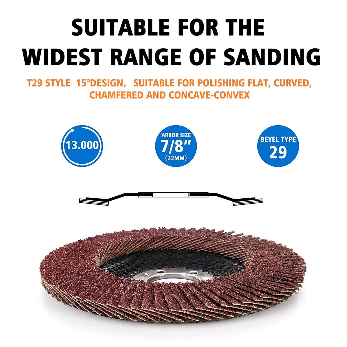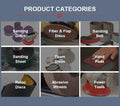 Abrasives: sanding discs, belts, sheets, grinding wheels, flap discs, non-woven pads