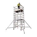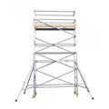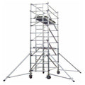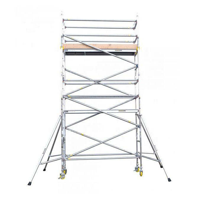 Towers/scaffolds: aluminium frames, platforms with anti-slip surfaces, guardrails/toe boards, locking castors (tower systems)