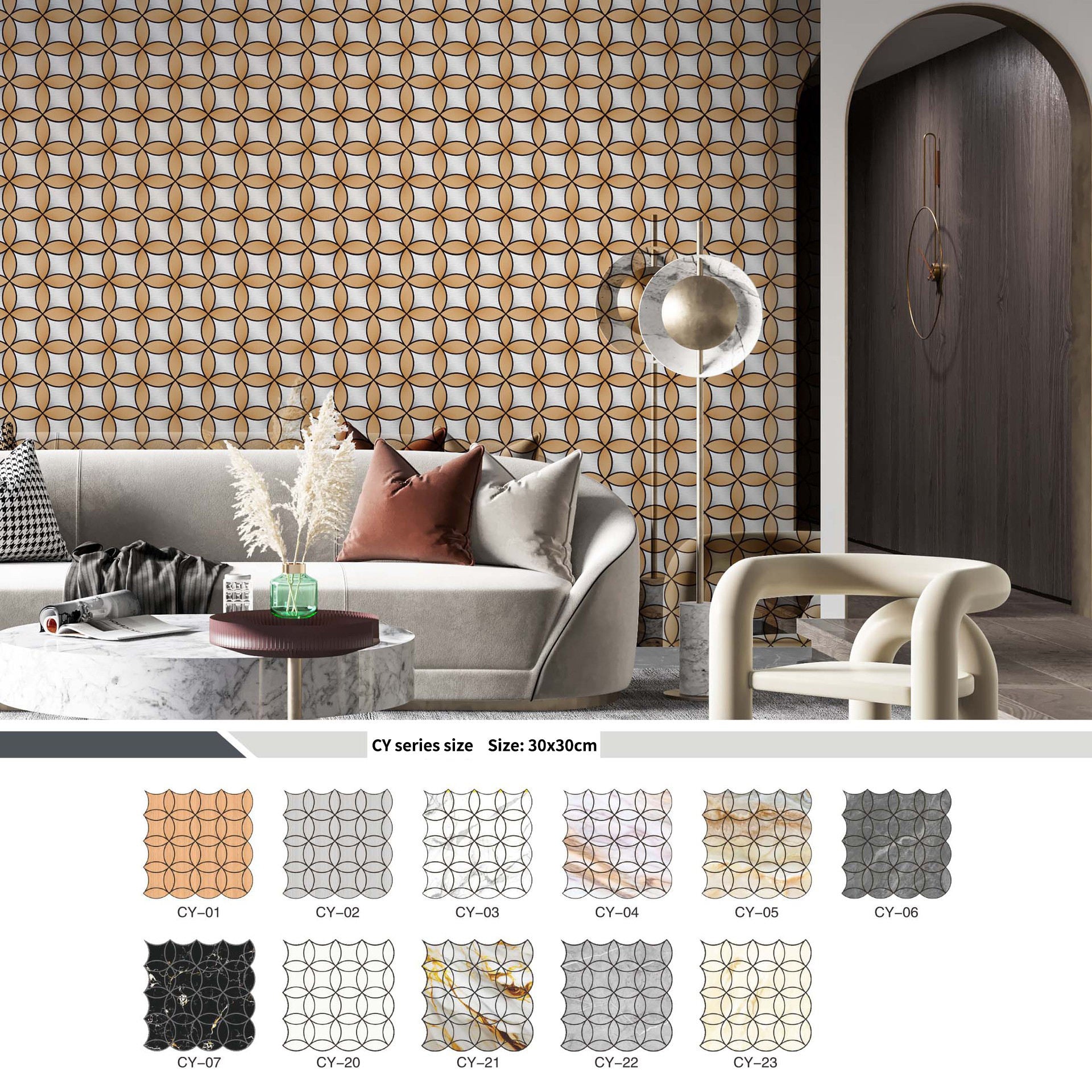 - Ceramic/porcelain mosaics (glazed or matte; patterned feature mosaics)
